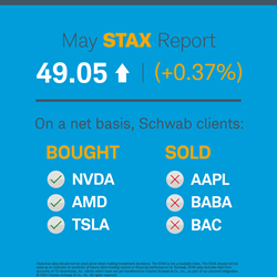 The Schwab Trading Activity Index™ (STAX) increased to 49.05 in May, up slightly from its score of 48.87 in April. The only index of its kind, the STAX is a proprietary, behavior-based index that analyzes retail investor stock positions and trading activity from Schwab’s millions of client accounts to illuminate what investors were actually doing and how they were positioned in the markets each month.