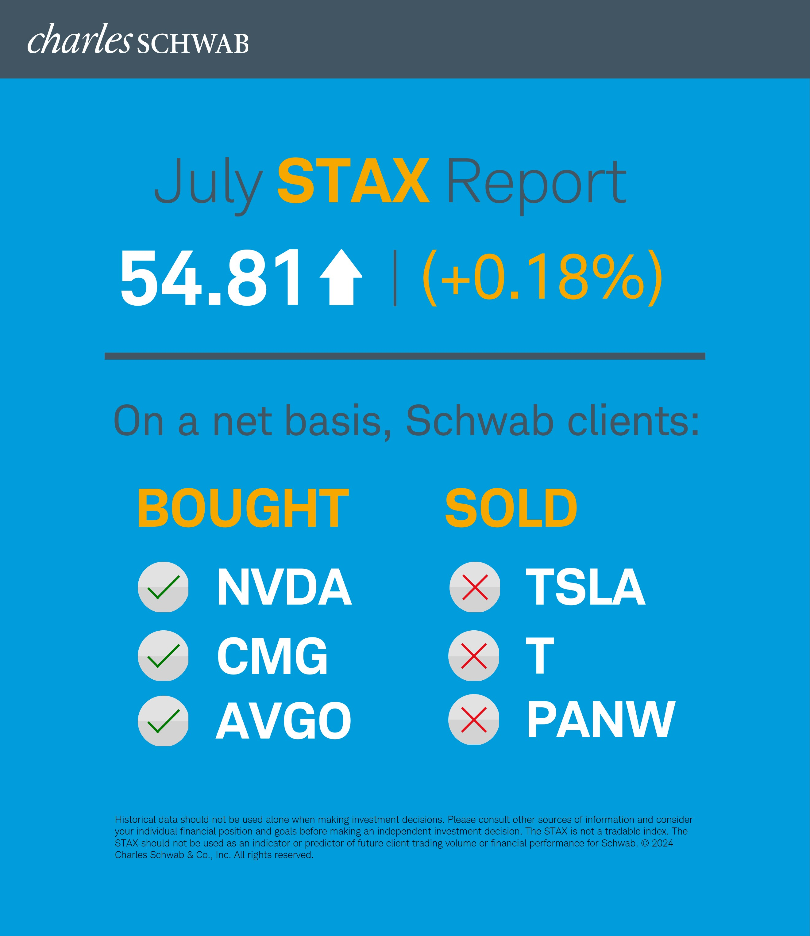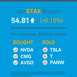The Schwab Trading Activity Index™ (STAX) increased slightly to 54.81 in July, up from its score of 54.71 in June. The only index of its kind, the STAX is a proprietary, behavior-based index that analyzes retail investor stock positions and trading activity from Schwab’s millions of client accounts to illuminate what investors were actually doing and how they were positioned in the markets each month.